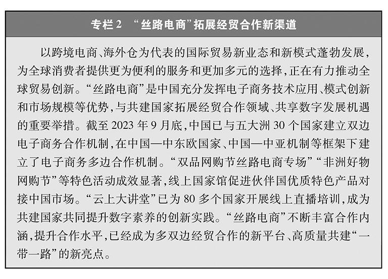 促进全球贸易发展。共建“一带一路”有计划、有步骤地推进交通、信息等基础设施建设和贸易投资自由化便利化,消除了共建国家内部、跨国和区域间的交通运输瓶颈及贸易投资合作障碍,极大提升了对外贸易、跨境物流的便捷度和国内国际合作效率,构建起全方位、多层次、复合型的贸易畅通网络,推动建立全球贸易新格局,对全球贸易发展发挥了重要促进作用。同时,共建“一带一路”增强了参与国家和地区对全球优质资本的吸引力,提升了其在全球跨境直接投资中的地位。其中,2022年东南亚跨境直接投资流入额占全球比重达到17.2%,较2013年上升了9个百分点;流入哈萨克斯坦的外商直接投资规模同比增速高达83%,为历史最高水平。世界银行《“一带一路”经济学:交通走廊的机遇与风险》研究报告显示,共建“一带一路”倡议提出之前,六大经济走廊的贸易低于其潜力的30%,外国直接投资低于其潜力的70%;共建“一带一路”实施以来,仅通过基础设施建设,就可使全球贸易成本降低1.8%,使中国—中亚—西亚经济走廊上的贸易成本降低10%,为全球贸易便利化和经济增长作出重要贡献;将使参与国贸易增长2.8%—9.7%、全球贸易增长1.7%—6.2%、全球收入增加0.7%—2.9%。