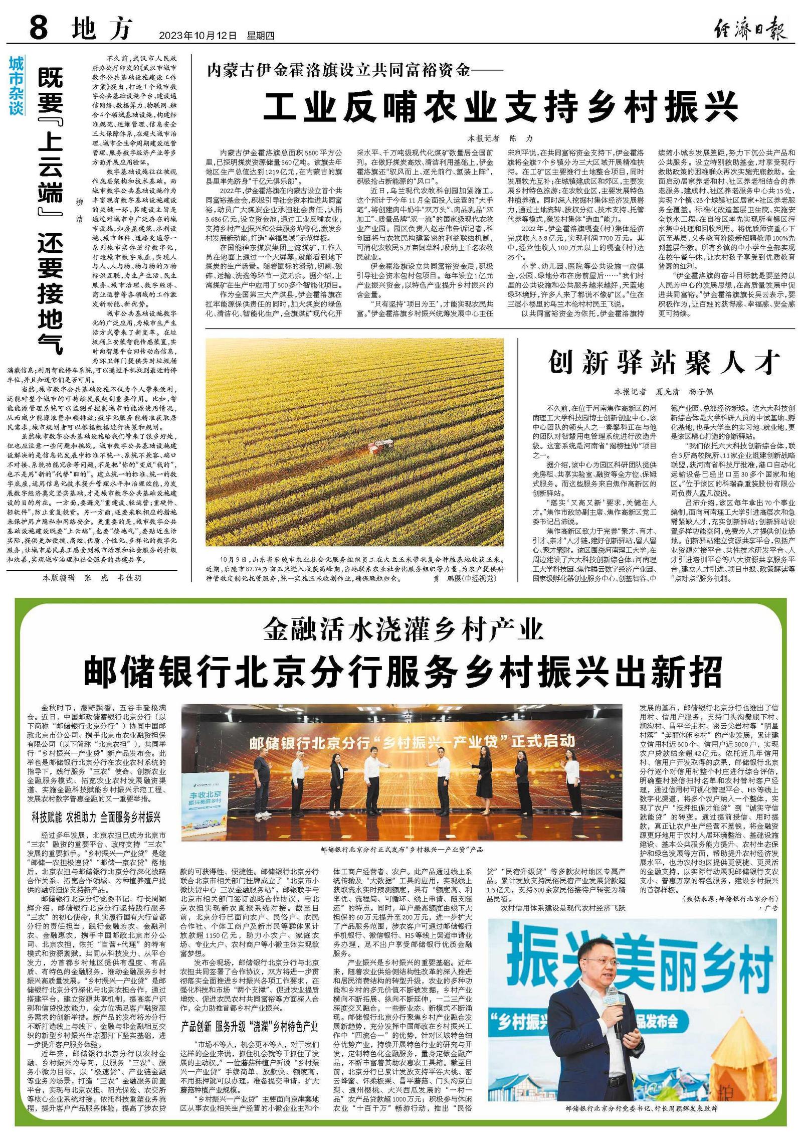 邮储银行北京分行党委书记、行长周颖辉介绍,邮储银行北京分行坚持践行服务“三农”的初心使命,扎实履行国有大行首都分行的责任担当,践行金融为农、金融利农、金融惠农,携手中国邮政北京市分公司、北京农担,依托“自营+代理”的特有模式和资源禀赋,共同从科技发力、从平台发力,为首都乡村地区提供有温度、有品质、有特色的金融服务,推动金融服务乡村振兴高质量发展。“乡村振兴—产业贷”是邮储银行北京分行深化与北京农担合作,通过搭建平台,建立资源共享机制,提高客户识别和信贷投放能力,全方位满足客户融资服务需求的创新举措。新产品的发布将为分行不断打造线上与线下、金融与非金融相互交织的新型乡村振兴生态圈打下坚实基础,进一步提升客户服务体验。