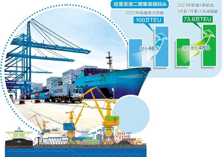 2023年4月,码头正式推出修洗验箱(MNR)延伸服务,中远海运集运、东方海外、达飞和马士基等海运公司开始陆续使用MNR服务,截至7月底已完成4514个集装箱修洗验箱。5月30日,中国制造的最大载箱量为24188TEU的全球最大级别集装箱船“东方西班牙”(OOCL SPAIN)首航靠泊阿布扎比码头,创造了哈里发港超大型船舶靠泊纪录,码头由此成为全球约20家可操作2.4万TEU以上超大船舶的集装箱码头之一。