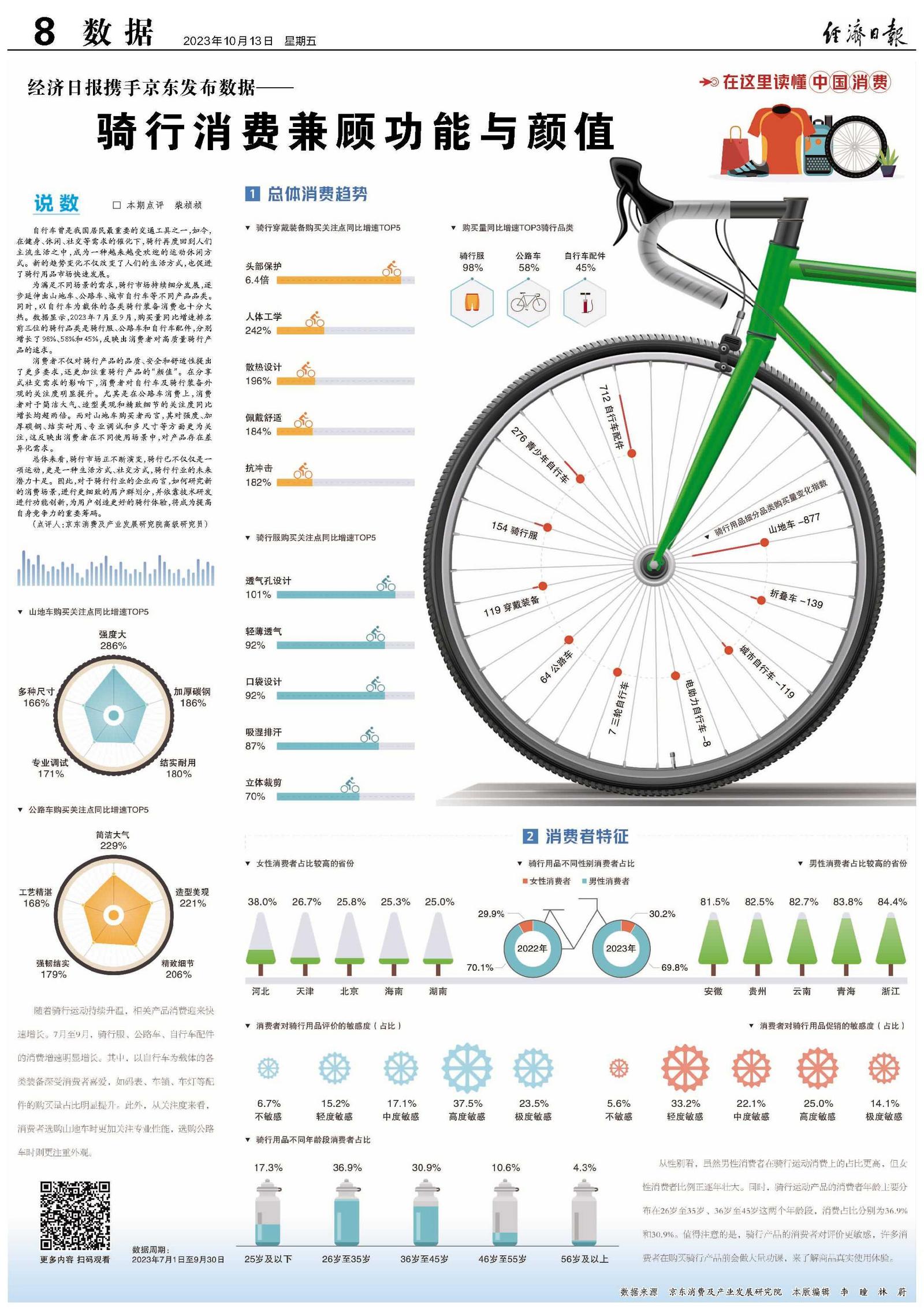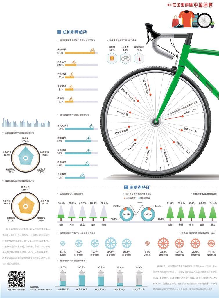 为满足不同场景的需求,骑行市场持续细分发展,逐步延伸出山地车、公路车、城市自行车等不同产品品类。同时,以自行车为载体的各类骑行装备消费也十分火热。数据显示,2023年7月至9月,购买量同比增速排名前三位的骑行品类是骑行服、公路车和自行车配件,分别增长了98%、58%和45%,反映出消费者对高质量骑行产品的追求。