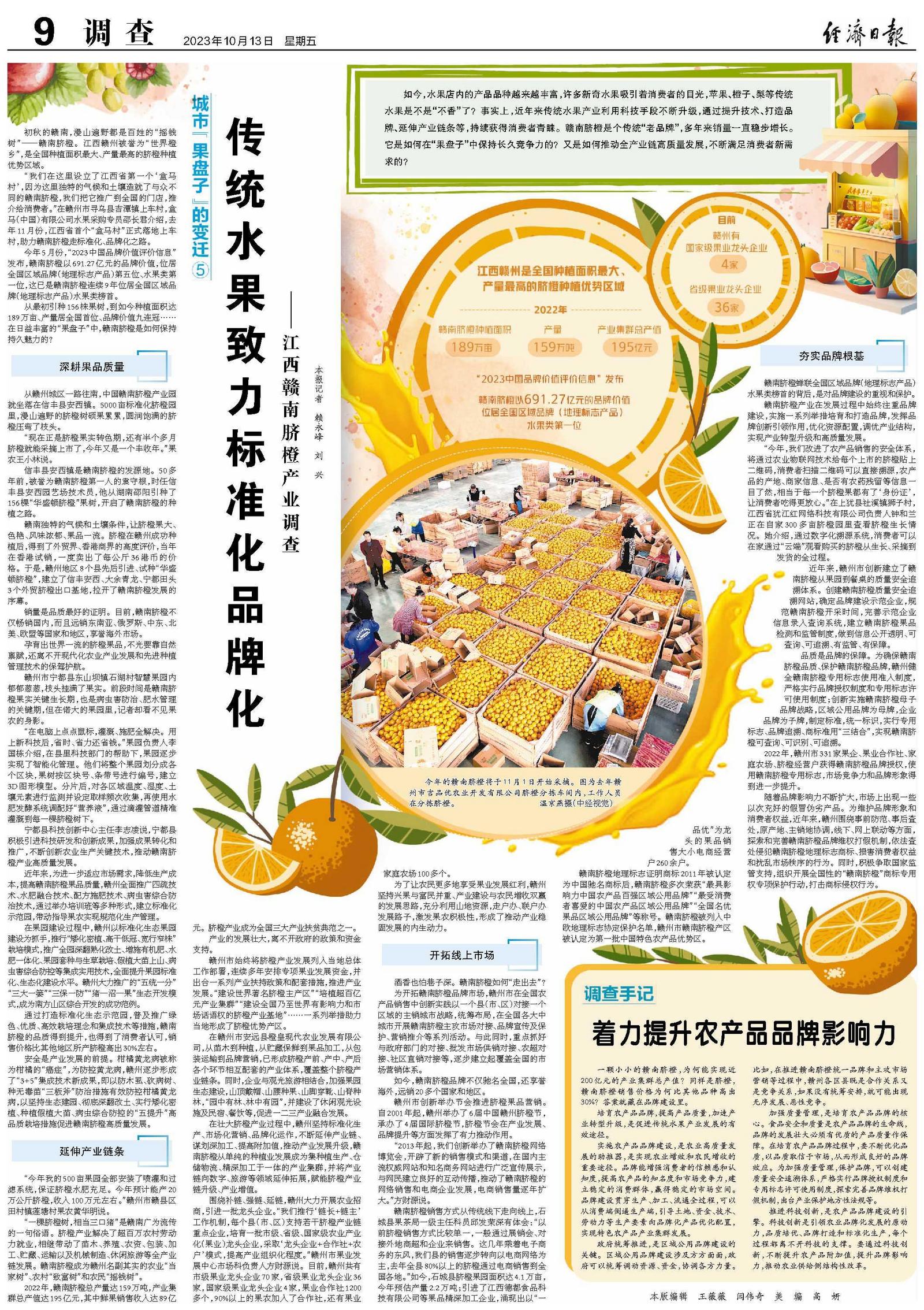 今年5月份,“2023中国品牌价值评价信息”发布,赣南脐橙以691.27亿元的品牌价值,位居全国区域品牌(地理标志产品)第五位、水果类第一位,这已是赣南脐橙连续9年位居全国区域品牌(地理标志产品)水果类榜首。