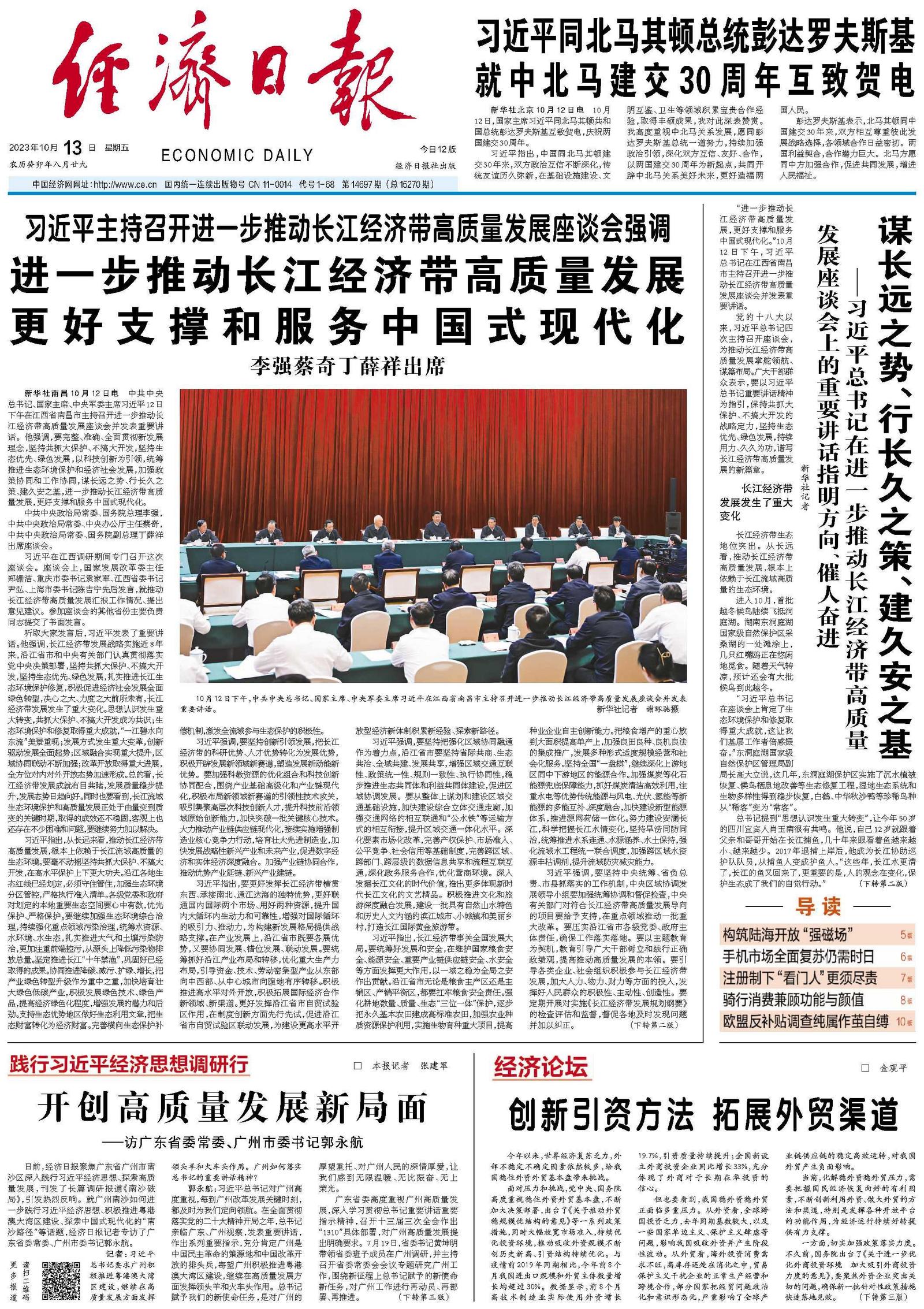 新华社南昌10月12日电 中共中央总书记、国家主席、中央军委主席习近平12日下午在江西省南昌市主持召开进一步推动长江经济带高质量发展座谈会并发表重要讲话。他强调,要完整、准确、全面贯彻新发展理念,坚持共抓大保护、不搞大开发,坚持生态优先、绿色发展,以科技创新为引领,统筹推进生态环境保护和经济社会发展,加强政策协同和工作协同,谋长远之势、行长久之策、建久安之基,进一步推动长江经济带高质量发展,更好支撑和服务中国式现代化。