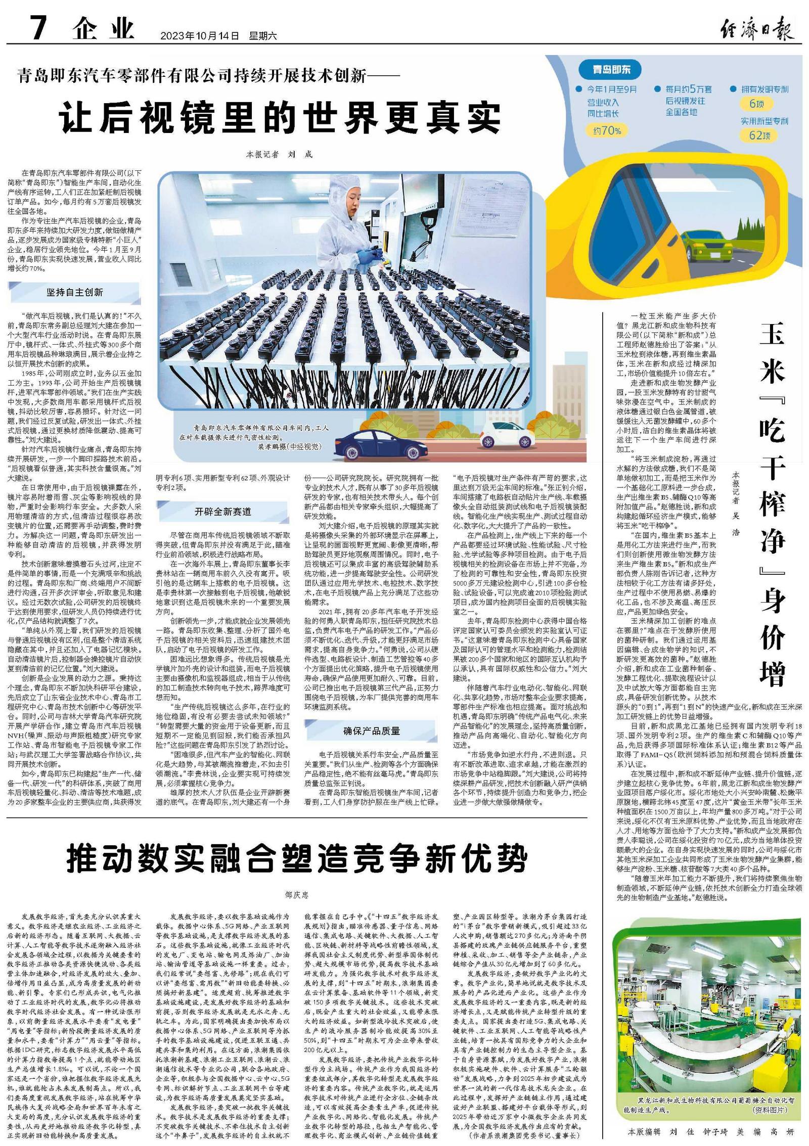 作为专注生产汽车后视镜的企业,青岛即东多年来持续加大研发力度,做细做精产品,逐步发展成为国家级专精特新“小巨人”企业,稳居行业领先地位。今年1月至9月份,青岛即东实现快速发展,营业收入同比增长约70%。