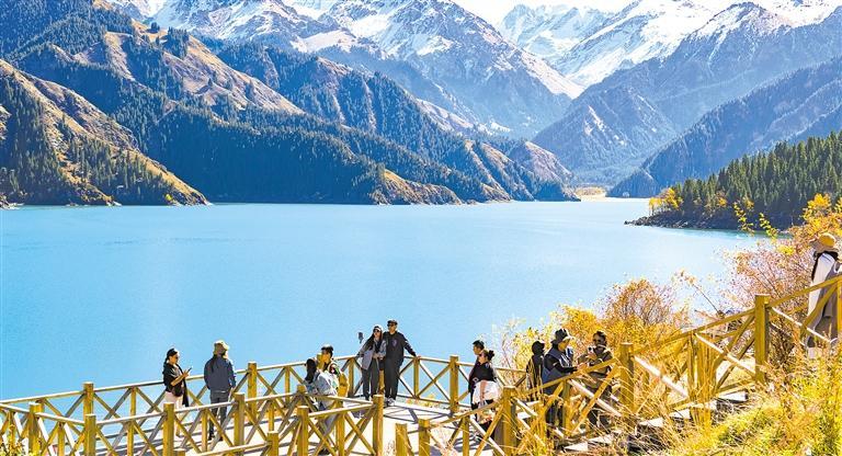 10月13日,新疆昌吉回族自治州天山天池风景区水清如镜,湖面碧波荡漾。金秋十月,天池风景区迎来了秋季赏景最佳时节,吸引全国各地游客前来观赏。何 龙摄(中经视觉)