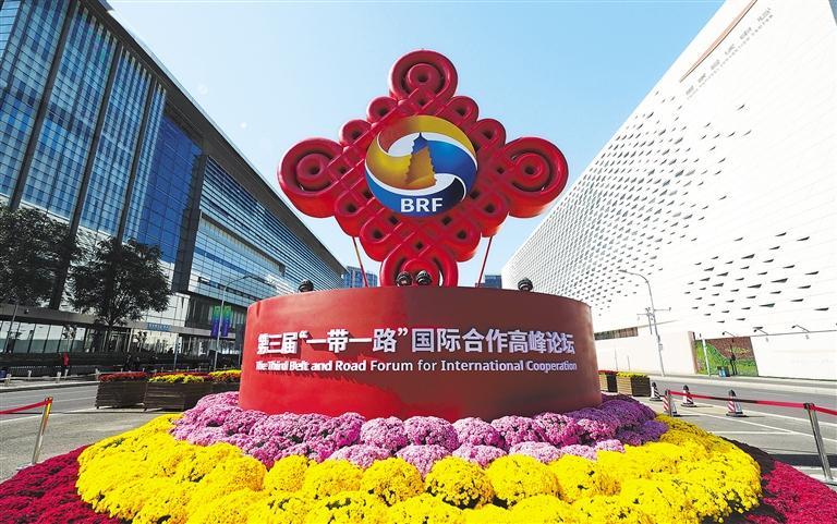 第三届“一带一路”国际合作高峰论坛举行在即,北京街头布置起相关雕塑、道旗、宣传标语,迎接盛会召开。这是10月15日拍摄的北京国家会议中心北侧第三届“一带一路”国际合作高峰论坛景观布置。杜建坡摄(中经视觉)