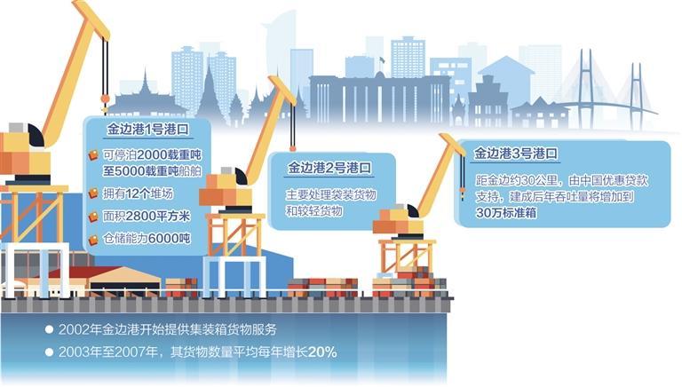 金边港自2002年开始提供集装箱货物服务。2003年至2007年间,其货物数量平均每年增长20%。2008年国际金融危机曾导致2009年通过金边港的集装箱运输量下降。但随着越南盖梅枢纽港于2009年6月开放,金边港的集装箱运输量开始复苏。新冠疫情暴发以来,全球供应链不畅,但金边港仍设法维持集装箱吞吐量,2022年稳定增长19.7%。