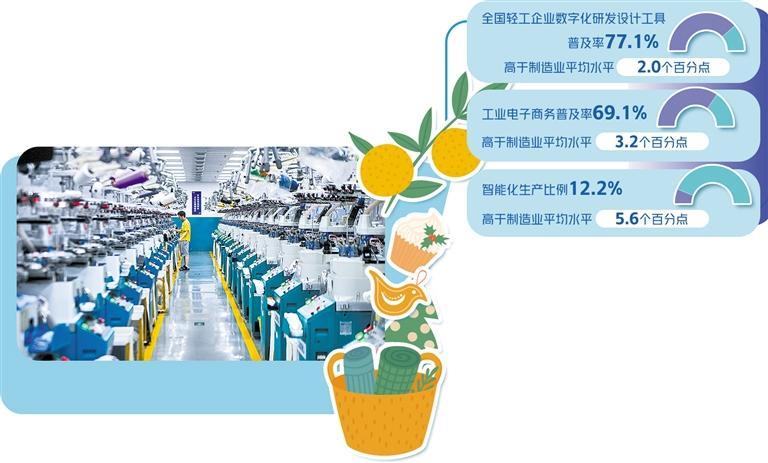 “以轻工业为例,全国轻工企业数字化研发设计工具普及率77.1%,工业电子商务普及率69.1%,分别高于制造业平均水平2.0个和3.2个百分点。”王孝洋说。