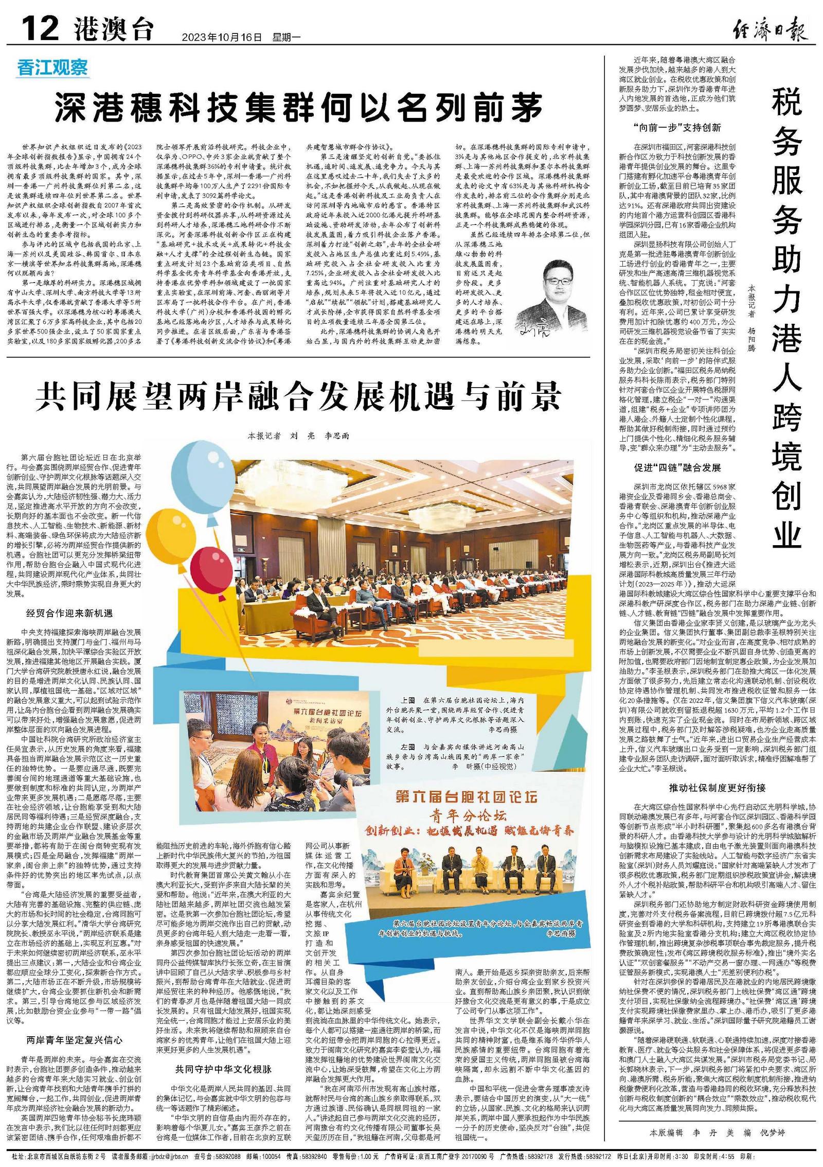 深圳市龙岗区依托辖区5968家港资企业及香港同乡会、香港总商会、香港青联会、深港澳青年创新创业服务中心等组织和机构,推动深港产业合作。“龙岗区重点发展的半导体、电子信息、人工智能与机器人、大数据、生物医药等产业,与香港科技产业发展方向一致。”龙岗区税务局副局长刘增松表示,近期,深圳出台《推进大运深港国际科教城高质量发展三年行动计划(2023—2025年)》,推动大运深港国际科教城建设大湾区综合性国家科学中心重要支撑平台和深港科教产研深度合作区,税务部门在助力深港产业链、创新链、人才链、教育链“四链”融合发展中发挥重要作用。