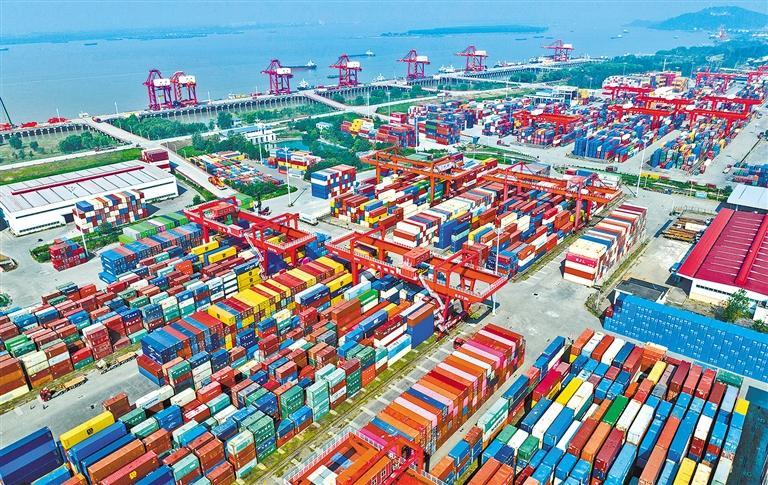 10月15日,在安徽省芜湖港朱家桥港区国际集装箱码头,运输车辆来回穿梭,一艘艘货船在码头泊位上有序装卸货物,一派繁忙景象。 肖本祥摄