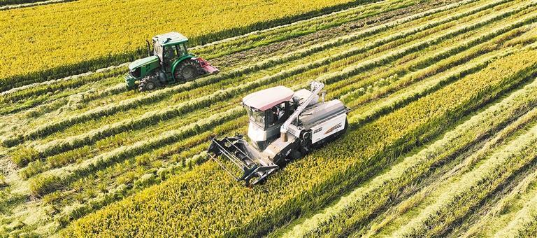 10月15日,在浙江省湖州市德清县新安镇下舍省级粮食生产功能区,农民驾驶收割机抢收晚稻。近日,德清县新安镇的晚稻陆续进入收获期,当地农民抢抓晴好天气,加紧收割、晾晒、翻地,到处一派丰收景象。
