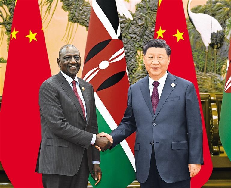 10月18日晚,国家主席习近平在北京人民大会堂会见来华出席第三届“一带一路”国际合作高峰论坛的肯尼亚总统鲁托。新华社记者 李学仁摄