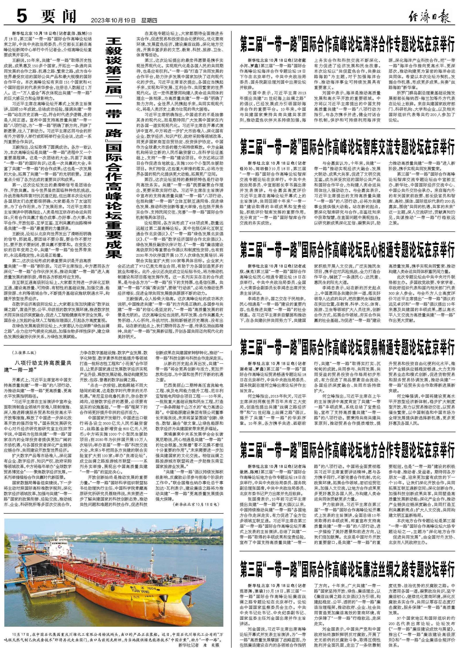 王毅指出,论坛取得了圆满成功。各方一致认为,本次高峰论坛是共建“一带一路”进程中又一个重要里程碑。这是一次团结的大会,巩固了共建“一带一路”的国际共识;这是一次共赢的大会,丰富了共建“一带一路”的合作成果;这也是一次发展的大会,拓展了共建“一带一路”的光明前景。王毅重点介绍了各方达成的重要共识和成果。