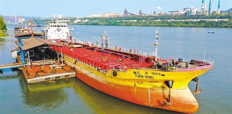 10月17日,在中国石化集团重庆川维化工有限公司物流码头,出口的产品正在装船。近日,中国石化川维化工公司的“万吨级天然气制乙炔成套技术”即将再次走出国门,出口乌兹别克斯坦,为当地提供绿色能源技术“中国方案”,助力“一带一路”。