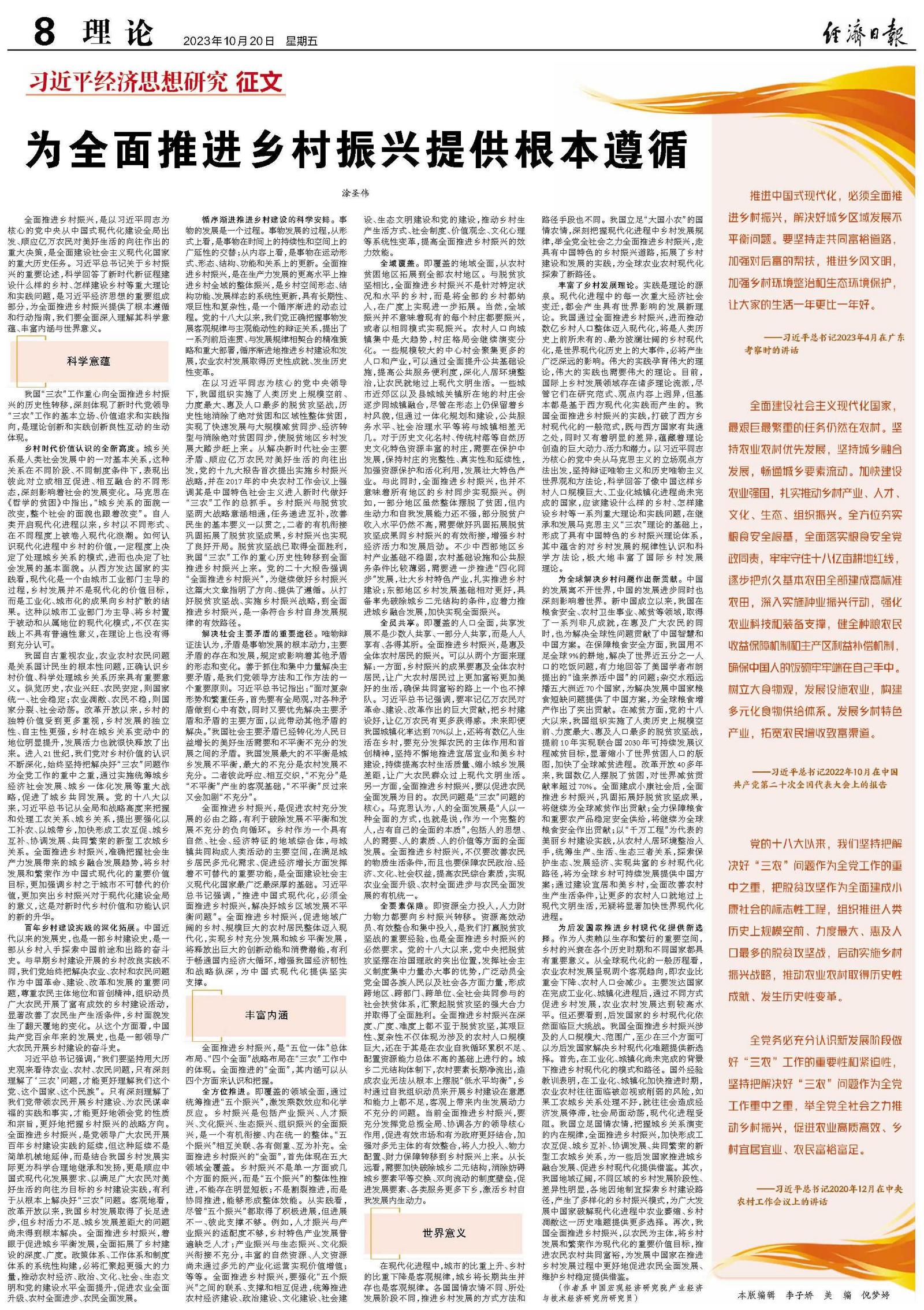 全面推进乡村振兴,是以习近平同志为核心的党中央从中国式现代化建设全局出发、顺应亿万农民对美好生活的向往作出的重大决策,是全面建设社会主义现代化国家的重大历史任务。习近平总书记关于乡村振兴的重要论述,科学回答了新时代新征程建设什么样的乡村、怎样建设乡村等重大理论和实践问题,是习近平经济思想的重要组成部分,为全面推进乡村振兴提供了根本遵循和行动指南,我们要全面深入理解其科学意蕴、丰富内涵与世界意义。
