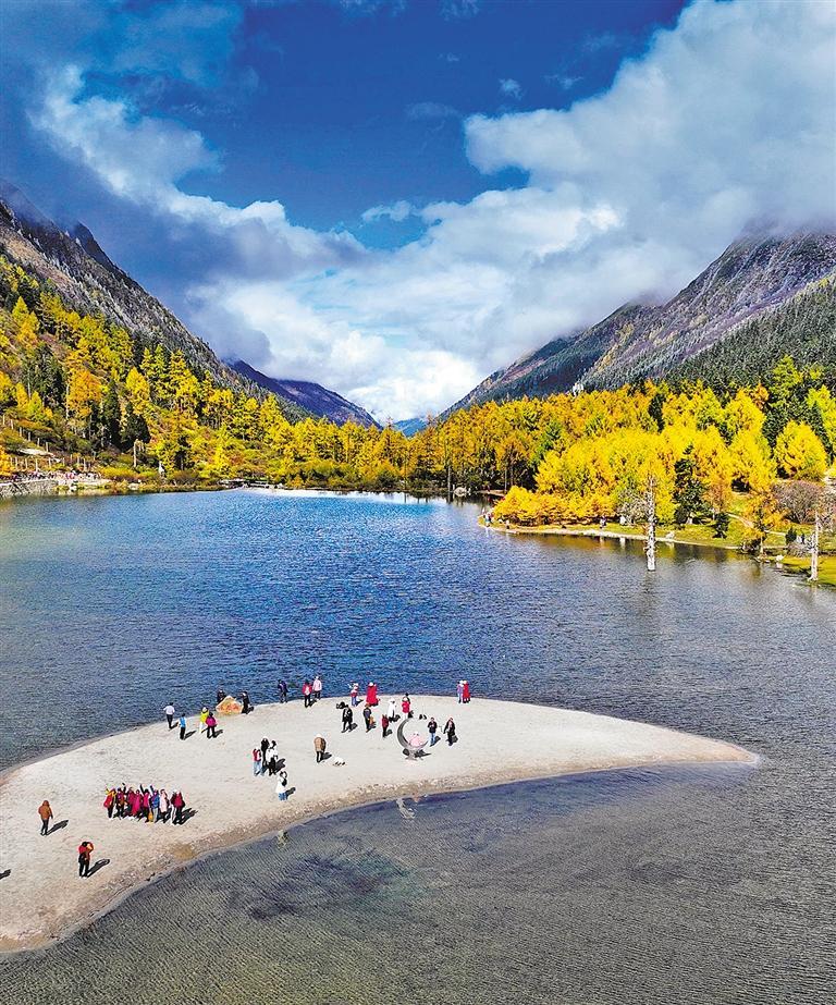 10月20日,游客在四川省阿坝藏族羌族自治州理县毕棚沟风景区游玩。金秋时节,毕棚沟风景区雪山、森林、湖泊交相辉映,吸引各地游客前来观光游览。