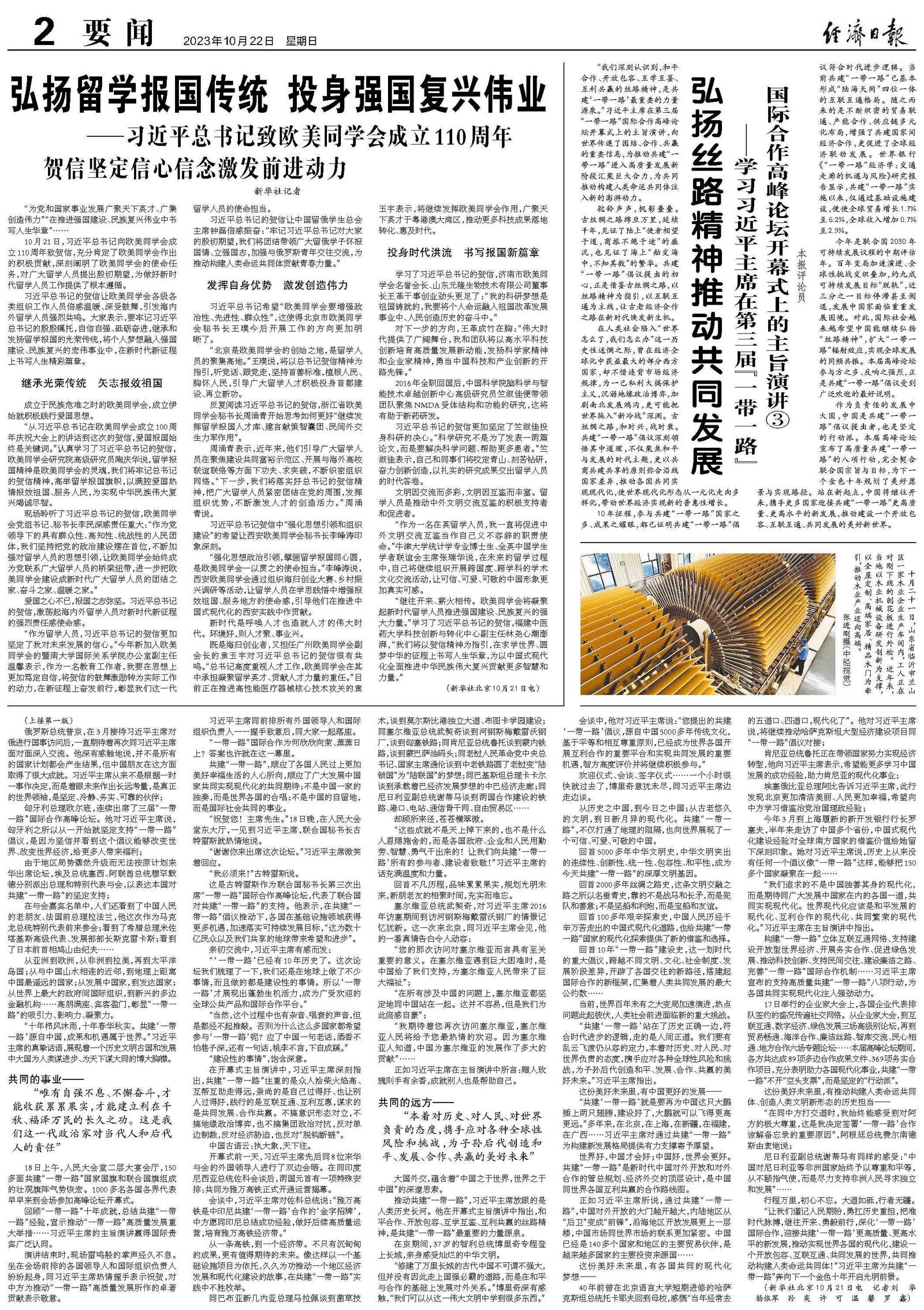 “我们深刻认识到,和平合作、开放包容、互学互鉴、互利共赢的丝路精神,是共建‘一带一路’最重要的力量源泉。”习近平主席在第三届“一带一路”国际合作高峰论坛开幕式上的主旨演讲,向世界传递了团结、合作、共赢的重要信息,为推动共建“一带一路”进入高质量发展新阶段汇聚巨大合力,为共同推动构建人类命运共同体注入新的澎湃动力。