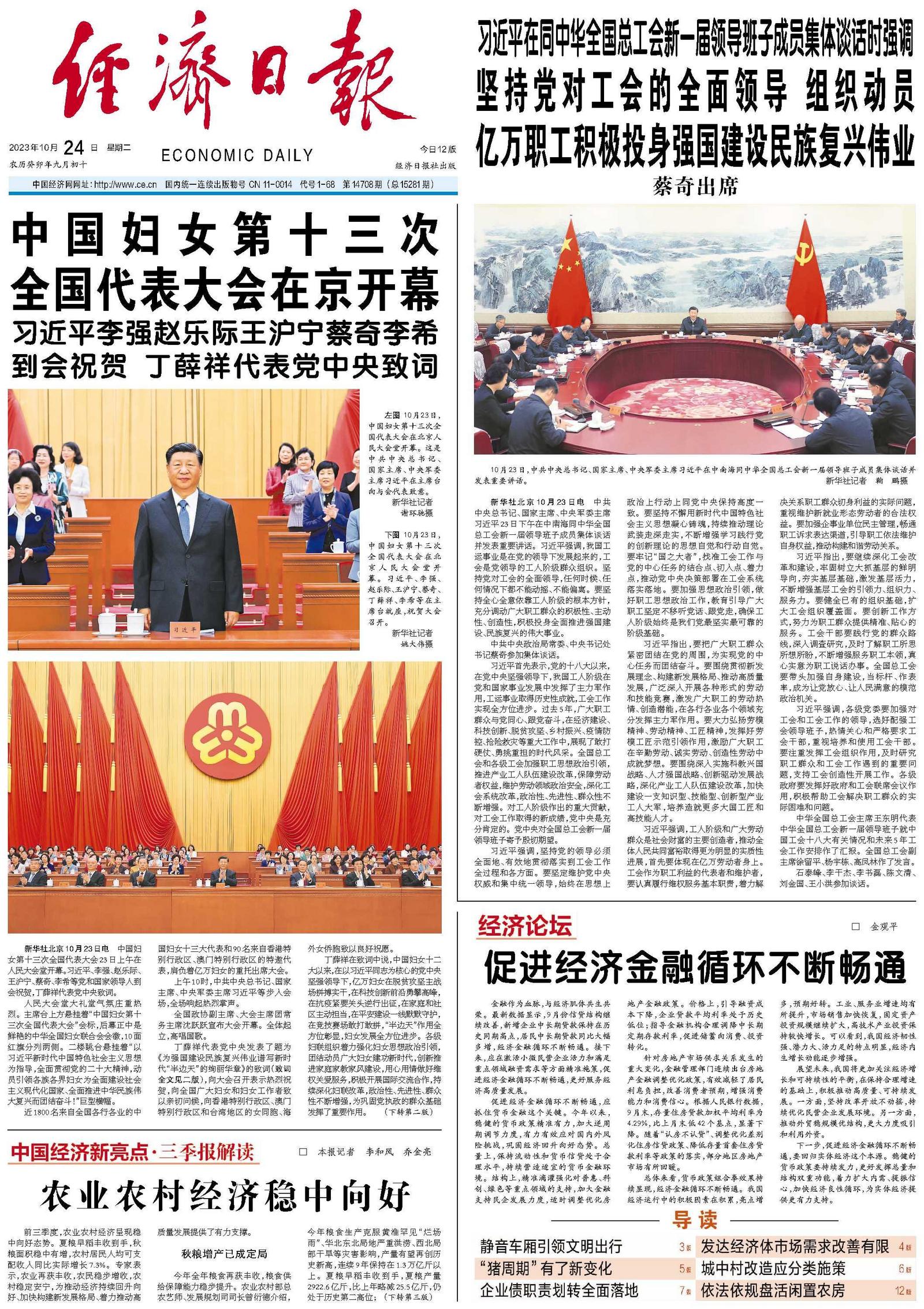 下图 10月23日,中国妇女第十三次全国代表大会在北京人民大会堂开幕。习近平、李强、赵乐际、王沪宁、蔡奇、丁薛祥、李希等在主席台就座,祝贺大会召开。 新华社记者 姚大伟摄
