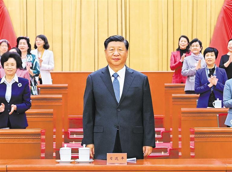 左图 10月23日,中国妇女第十三次全国代表大会在北京人民大会堂开幕。这是中共中央总书记、国家主席、中央军委主席习近平在主席台向与会代表致意。 新华社记者 谢环驰摄