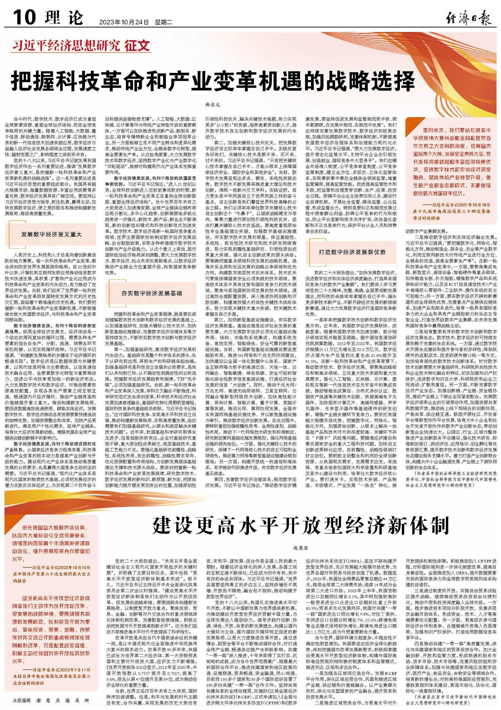 党的二十大报告提出,“加快发展数字经济,促进数字经济和实体经济深度融合,打造具有国际竞争力的数字产业集群”。我们要深入学习贯彻党的二十大精神,完整、准确、全面贯彻新发展理念,把科技的命脉牢牢掌握在自己手中,催生更多新技术新产业,不断开辟经济发展的新领域新赛道,通过大力发展数字经济打造国际竞争新优势。