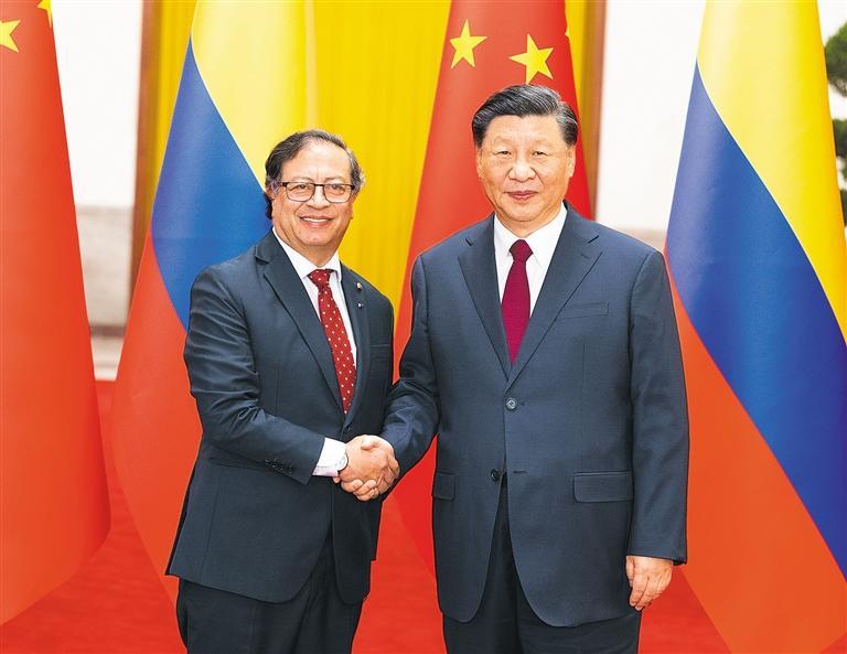 佩特罗表示,很高兴时隔多年再次访华,今天的中国和世界已经发生了巨大变化,中国革命和建设的理论与实践具有重要启示意义。哥方高度重视习近平主席提出的“一带一路”倡议。哥中建立战略伙伴关系之后,哥方愿将自身区位优势和发展战略同“一带一路”倡议对接,加强基础设施、清洁能源等领域合作,欢迎中国企业赴哥投资,推动双边贸易关系更加平衡发展,这有助于帮助哥伦比亚推进国内和平进程,实现人民渴望的和平稳定与就业增长,也将增强地区和世界的互联互通。哥方愿同中方就巴以局势等问题保持沟通,推动尽快找到止战降温的解决方案。哥方欢迎习近平主席提出的全球发展倡议、全球安全倡议、全球文明倡议,愿同中方在多边机制内加强沟通协作。哥方支持拉中论坛建设,愿利用2025年担任拉共体轮值主席国契机,积极推动拉中关系不断发展。