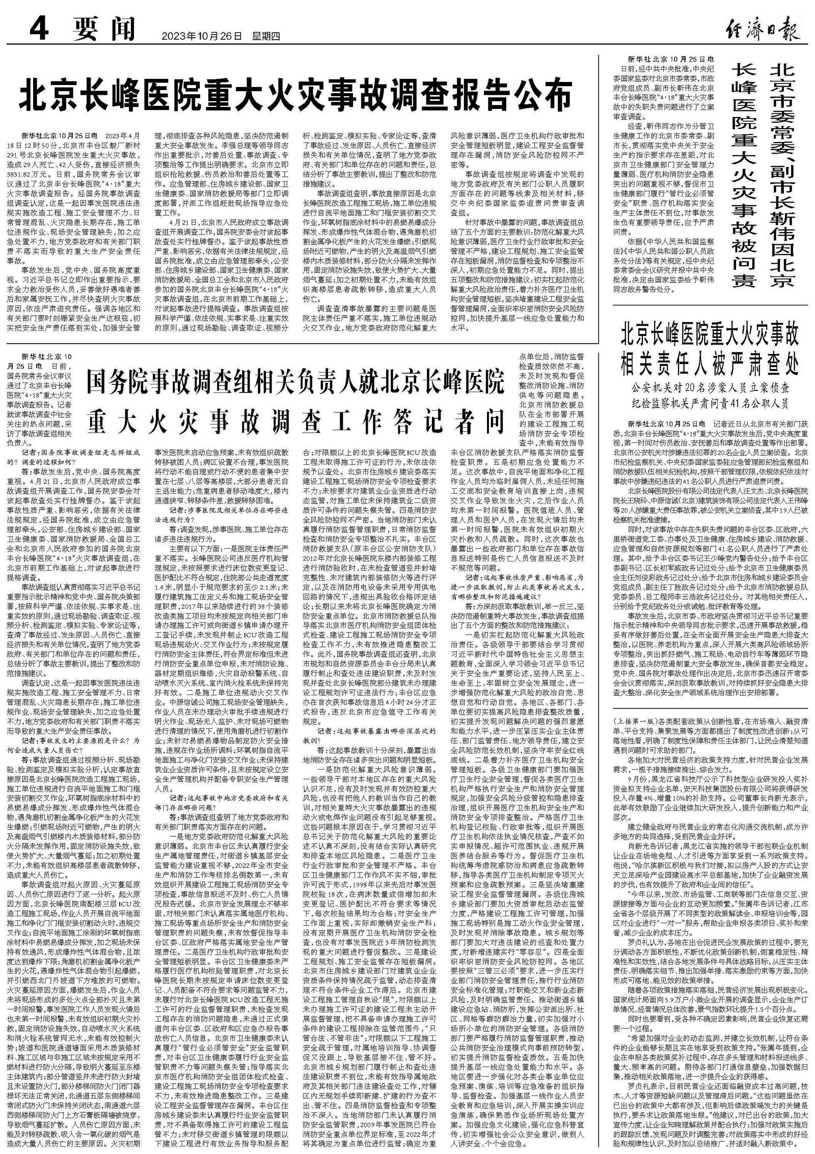新华社北京10月25日电 2023年4月18日12时50分,北京市丰台区靛厂新村291号北京长峰医院发生重大火灾事故,造成29人死亡、42人受伤,直接经济损失3831.82万元。日前,国务院常务会议审议通过了北京丰台长峰医院“4·18”重大火灾事故调查报告。经国务院事故调查组调查认定,这是一起因事发医院违法违规实施改造工程、施工安全管理不力、日常管理混乱、火灾隐患长期存在,施工单位违规作业、现场安全管理缺失,加之应急处置不力,地方党委政府和有关部门职责不落实而导致的重大生产安全责任事故。
