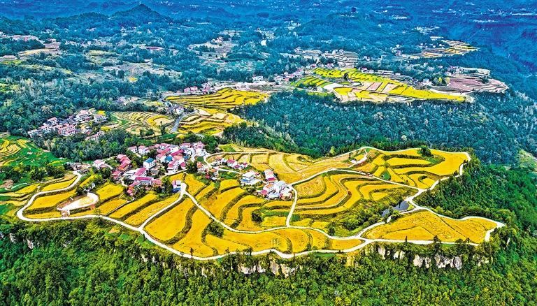 金秋十月,在海拔1200多米的重庆市万州区恒合土家族乡,连片的稻田进入收割期,丰收美景如画。近年来,该乡因地制宜建设2万亩宜机化高标准农田,探索“稻田+”生态产业模式,走上农文旅融合发展之路。 冉孟军摄(中经视觉)