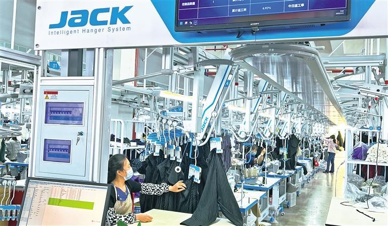 不仅高效,而且智能。在雅戈尔,上衣能自己“选”裤子。在雅戈尔的智能化生产车间里,系统会根据衣架上的序列码,对上衣和裤子进行扫描配对,确认颜色、尺码等信息,再成套送进仓库……