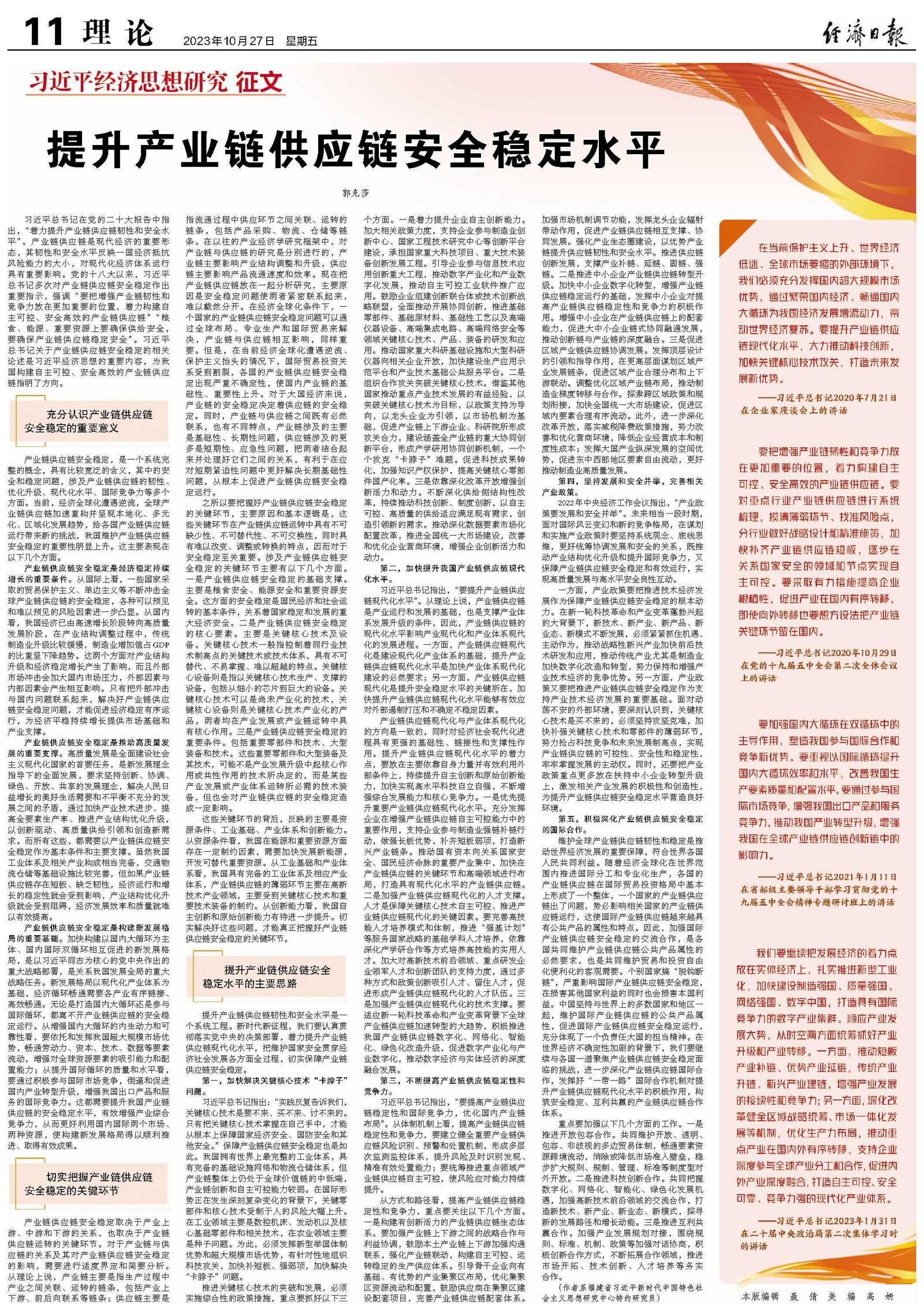 习近平总书记在党的二十大报告中指出,“着力提升产业链供应链韧性和安全水平”。产业链供应链是现代经济的重要形态,其韧性和安全水平反映一国经济抵抗风险能力的大小,对现代化经济体系运行具有重要影响。党的十八大以来,习近平总书记多次对产业链供应链安全稳定作出重要指示,强调“要把增强产业链韧性和竞争力放在更加重要的位置,着力构建自主可控、安全高效的产业链供应链”“粮食、能源、重要资源上要确保供给安全,要确保产业链供应链稳定安全”。习近平总书记关于产业链供应链安全稳定的相关论述是习近平经济思想的重要内容,为我国构建自主可控、安全高效的产业链供应链指明了方向。