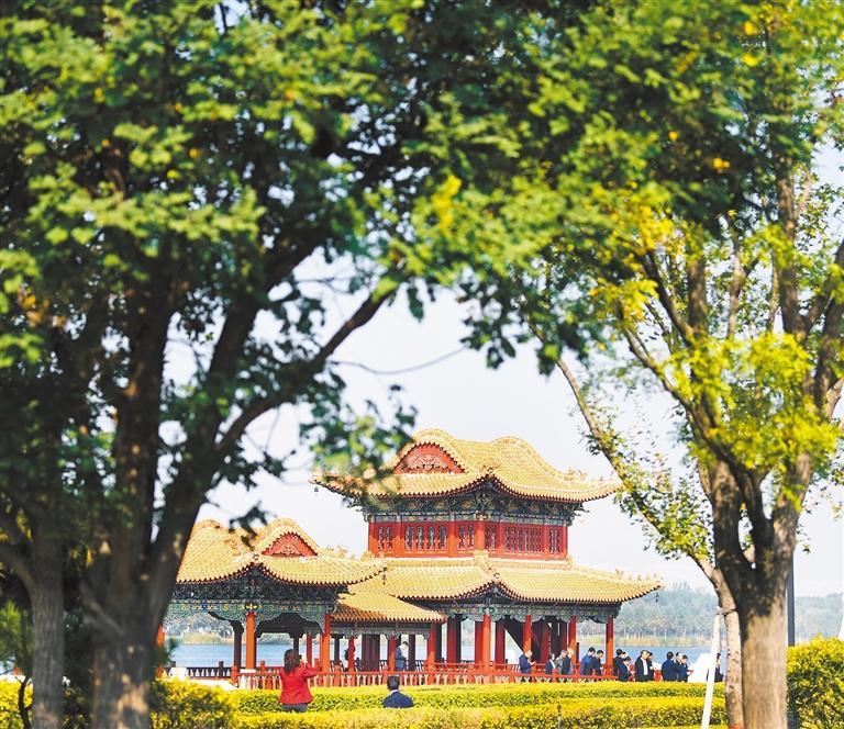 ②游客在太原市雁丘园好问楼上观赏汾河景色。新建成的太原汾河景区四期雁丘园,是展现太原城市形象的文旅新名片。
