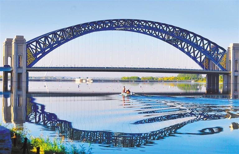 ①护河员在太原晋阳桥下水面上巡查。晋阳桥是太原市横跨汾河的第19座大桥,融合了古典与现代之美。