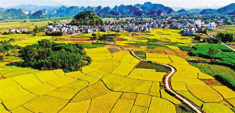 晚秋时节,融水县种植的6.4万亩晚稻迎来成熟期,金色的稻田与村落、田间小路交织在一起,一派乡村和美景象。