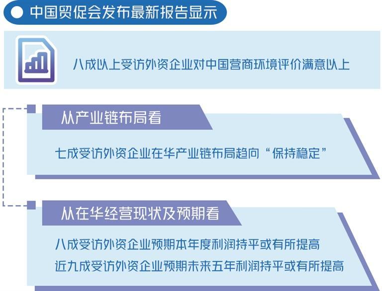 贸促会新闻发言人张鑫在当天举行的例行新闻发布会上介绍该报告调研结果时指出,从产业链布局看,七成受访外资企业在华产业链布局趋向“保持稳定”,这一比例较二季度环比提高4.57个百分点。从在华经营现状及预期看,八成受访外资企业预期本年度利润持平或有所提高,近九成预期未来五年利润持平或有所提高。从发展机遇看,受访外资企业连续三个季度认为“技术创新与研发”是中国市场最大的发展机遇,约半数具有增资意愿的受访外资企业考虑在西部地区增资。从发展期盼看,受访外资企业普遍希望进一步“保证供应链、产业链稳定”“提高产业配套能力和集聚效应”“增强助企纾困政策的连续性、稳定性”。