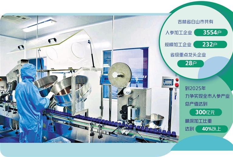 多年来,人们对人参用途的了解多是炖汤熬水补气。如今,通过发展人参精深加工,白山市已形成人参饮品、食品、保健品、化妆品、药品5大系列300余种800多款产品。自2015年起,靖宇县中民康达有限公司就从主要售卖人参初级产品转向主要售卖人参加工产品,产品之一就是人参纯粉片。“人参里含有人参皂苷,有利于提神补气,做成纯粉片方便携带,可以按量进行常态化服用。”该公司有关负责人颜旭说。