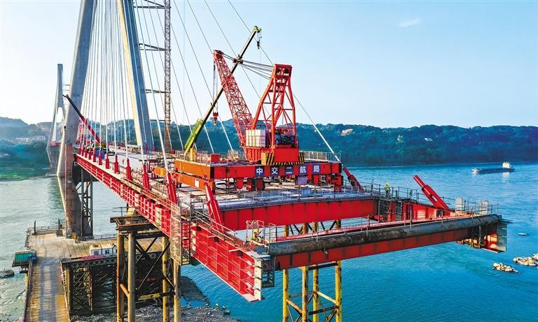10月29日,四川省泸州市榕山长江大桥钢箱梁吊装加紧建设。该大桥预计明年通车,通车后将进一步推动泸州交通与重庆毗邻地区互联互通,有效融入成渝地区双城经济圈。李贵平摄(中经视觉)
