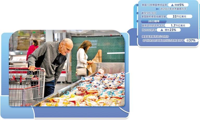 美联储能维持高利率多长时间,需要看美国经济表现。最新数据显示,三季度美国经济环比折年率增长4.9%,大幅超出预期,然而数据发布当天美国股市却反响平平。民众对于“拜登经济学”也不买账。据美国盖洛普咨询公司统计,8月份民众对拜登政府经济政策的支持率仅为37%,甚至跌破特朗普执政时期的最低水平。有分析认为,这主要是因为经济实际体感与强劲的消费数据并不匹配,美联储激进加息导致房贷、车贷利率飙升,物价上涨使人们对生活满意度大大降低。