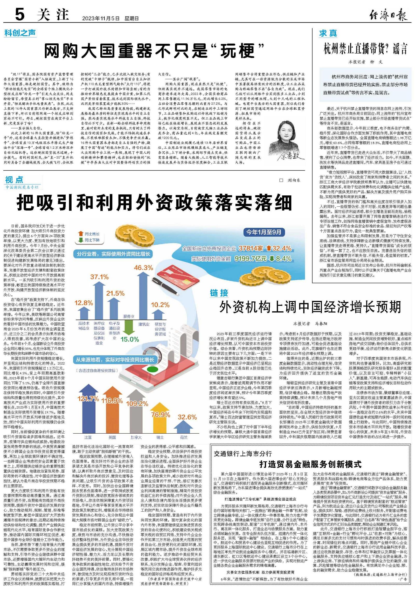 在“稳外资”政策支持下,外商在华投资信心有所恢复且渐趋稳定。近年来,我国密集出台了“稳外资”系列政策举措。今年以来,美欧等跨国公司高管纷纷来华访问考察,反映出外资企业依然看好中国市场的发展潜力。中国欧盟商会2023年6月份发布的商业调查显示,近三分之二的会员表示如果市场准入得到改善,将考虑扩大在中国的业务。今年前8个月,全国新设立外商投资企业同比增长33%,也充分体现了外商在华长期投资和深耕中国市场的信心。