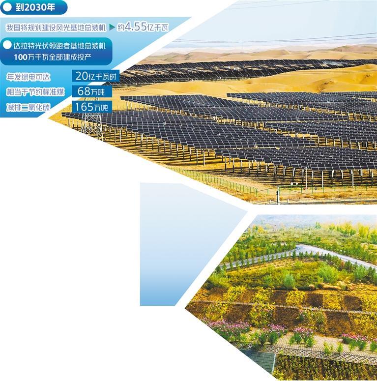 6个月后,库布其沙漠鄂尔多斯中北部新能源基地项目获批。该项目是国家首批首个千万千瓦级“沙戈荒”风光火储新能源基地项目,项目建设光伏800万千瓦、风电400万千瓦。项目建成后,每年可向京津冀地区送电约440亿千瓦时。其中清洁电量占比50%以上,相当于节约标准煤约600万吨,减排二氧化碳约1600万吨,电力供应保障和生态环境效益显著。