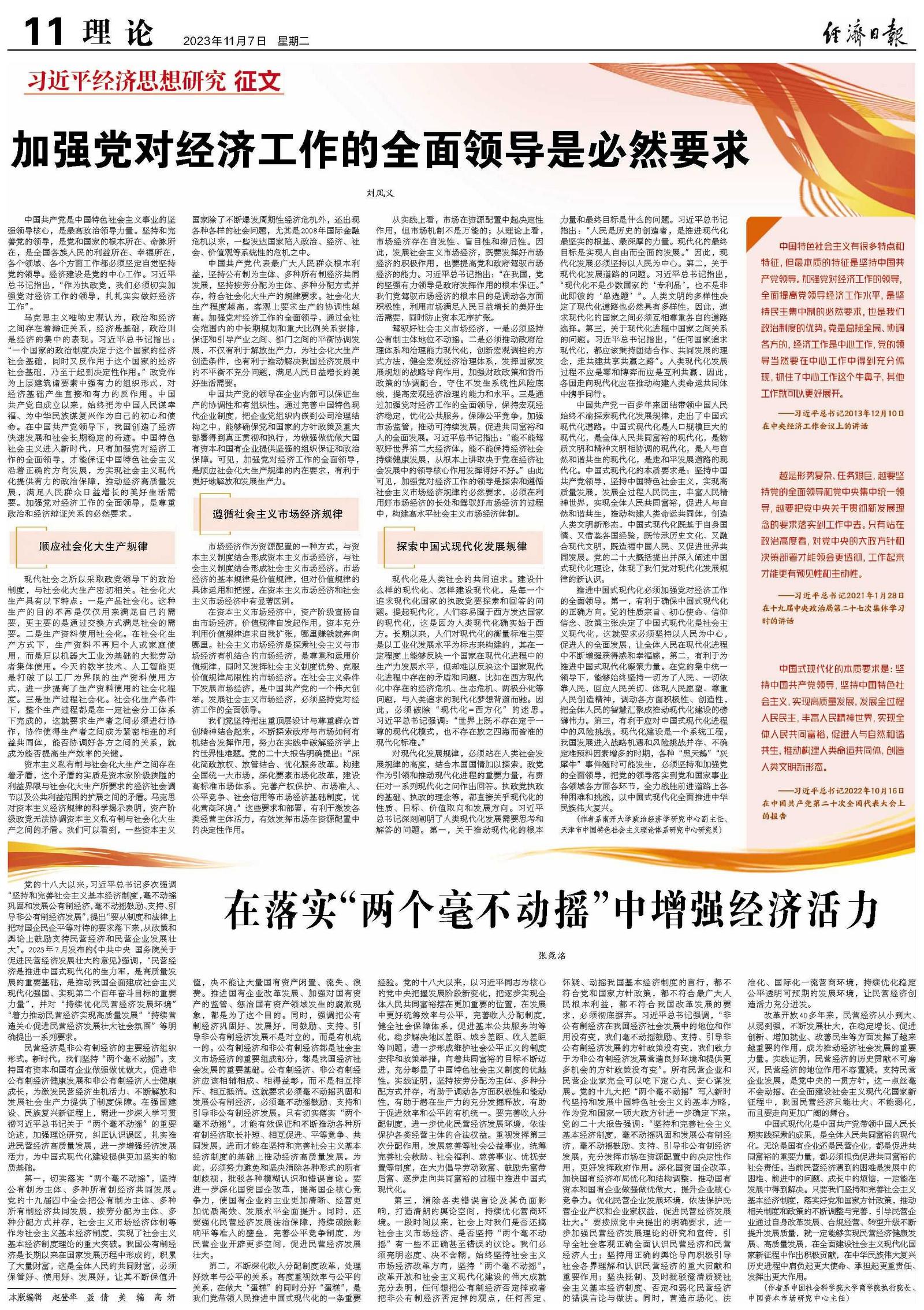 中国共产党是中国特色社会主义事业的坚强领导核心,是最高政治领导力量。坚持和完善党的领导,是党和国家的根本所在、命脉所在,是全国各族人民的利益所在、幸福所在,各个领域、各个方面工作都必须坚定自觉坚持党的领导。经济建设是党的中心工作。习近平总书记指出,“作为执政党,我们必须切实加强党对经济工作的领导,扎扎实实做好经济工作”。