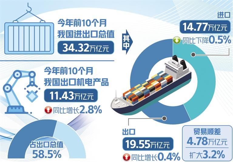 前10个月,我国进出口总值34.32万亿元。其中,出口19.55万亿元,增长0.4%;进口14.77万亿元,下降0.5%;贸易顺差4.78万亿元,扩大3.2%。