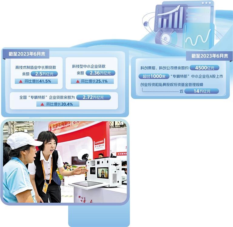 科技型企业贷款持续保持较快增长速度。截至2023年6月末,高技术制造业中长期贷款余额2.5万亿元,同比增长41.5%;科技型中小企业贷款余额2.36万亿元,同比增长25.1%;全国“专精特新”企业贷款余额为2.72万亿元,同比增长20.4%。