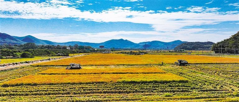 11月8日,安徽省芜湖市繁昌区峨山镇柏树村,在蓝天白云下,农户们抢抓晴好天气,驾驶收割机来回穿梭收割水稻,确保颗粒归仓,田间地头一派丰收景象。