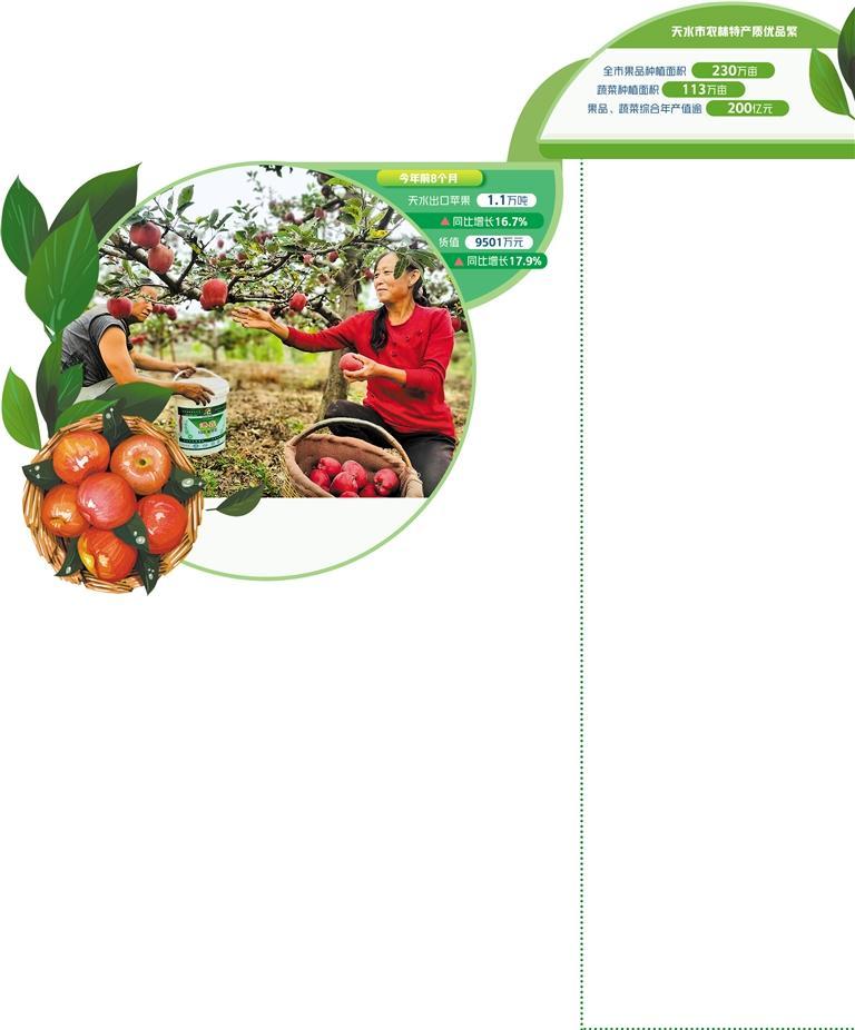 地处秦岭西段的天水市跨长江、黄河两大流域,海拔多在1000米至2000米之间,是我国北方最佳水果蔬菜生产基地之一,农林特产质优品繁,全市果品种植面积230万亩,蔬菜种植面积113万亩,果品、蔬菜综合年产值逾200亿元。