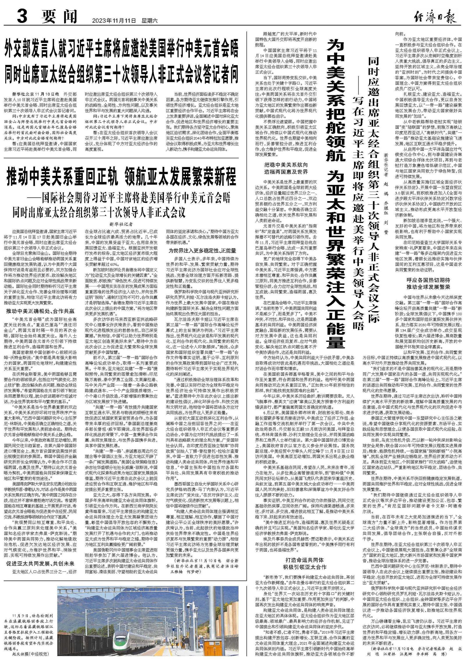 当下,国际局势变乱交织,中美关系也处于关键十字路口。习近平主席的此次行程吸引全球高度关注:中美两国关系将在元首外交引领下获得怎样的前行动力,中国将为亚太地区的发展繁荣作出哪些新贡献,中国式现代化将为世界现代化提供哪些启示。
