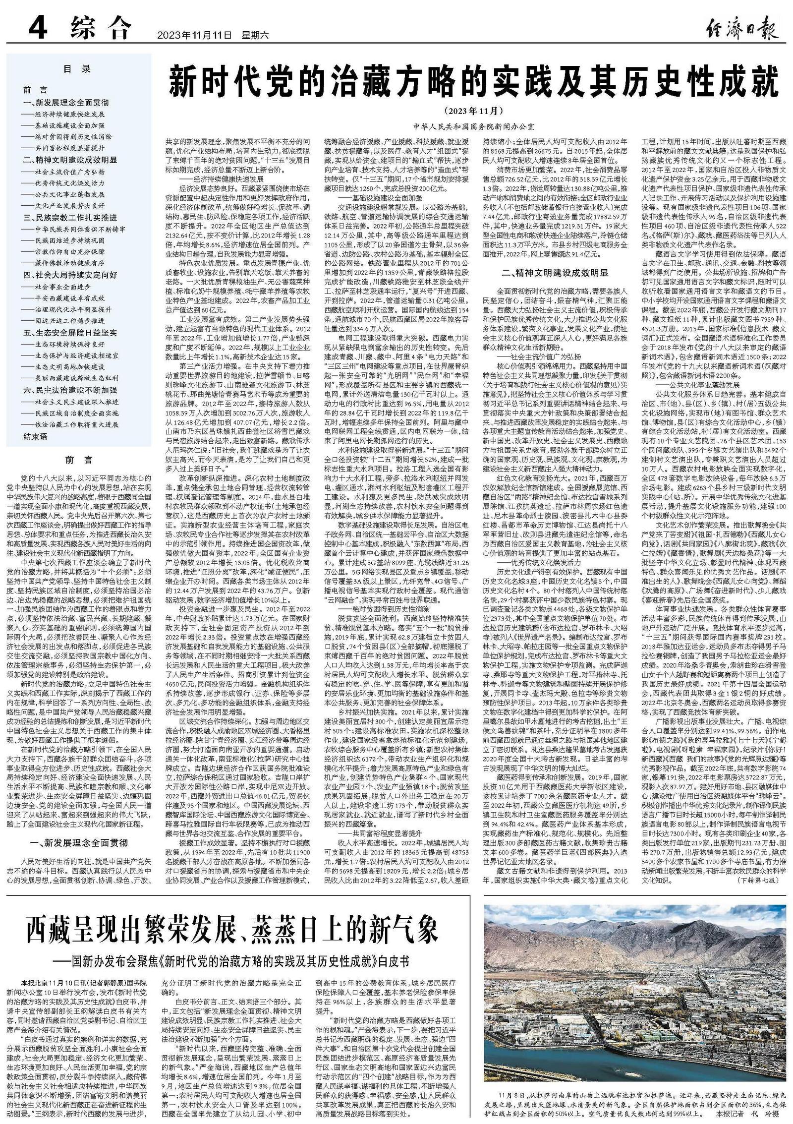 实践充分证明,只有全面深入贯彻落实新时代党的治藏方略,坚持所有发展都要赋予民族团结进步的意义,都要赋予维护统一、反对分裂的意义,都要赋予改善民生、凝聚人心的意义,都要有利于提升各族群众获得感、幸福感、安全感,抓好稳定、发展、生态、强边四件大事,才能确保西藏长治久安和高质量发展。