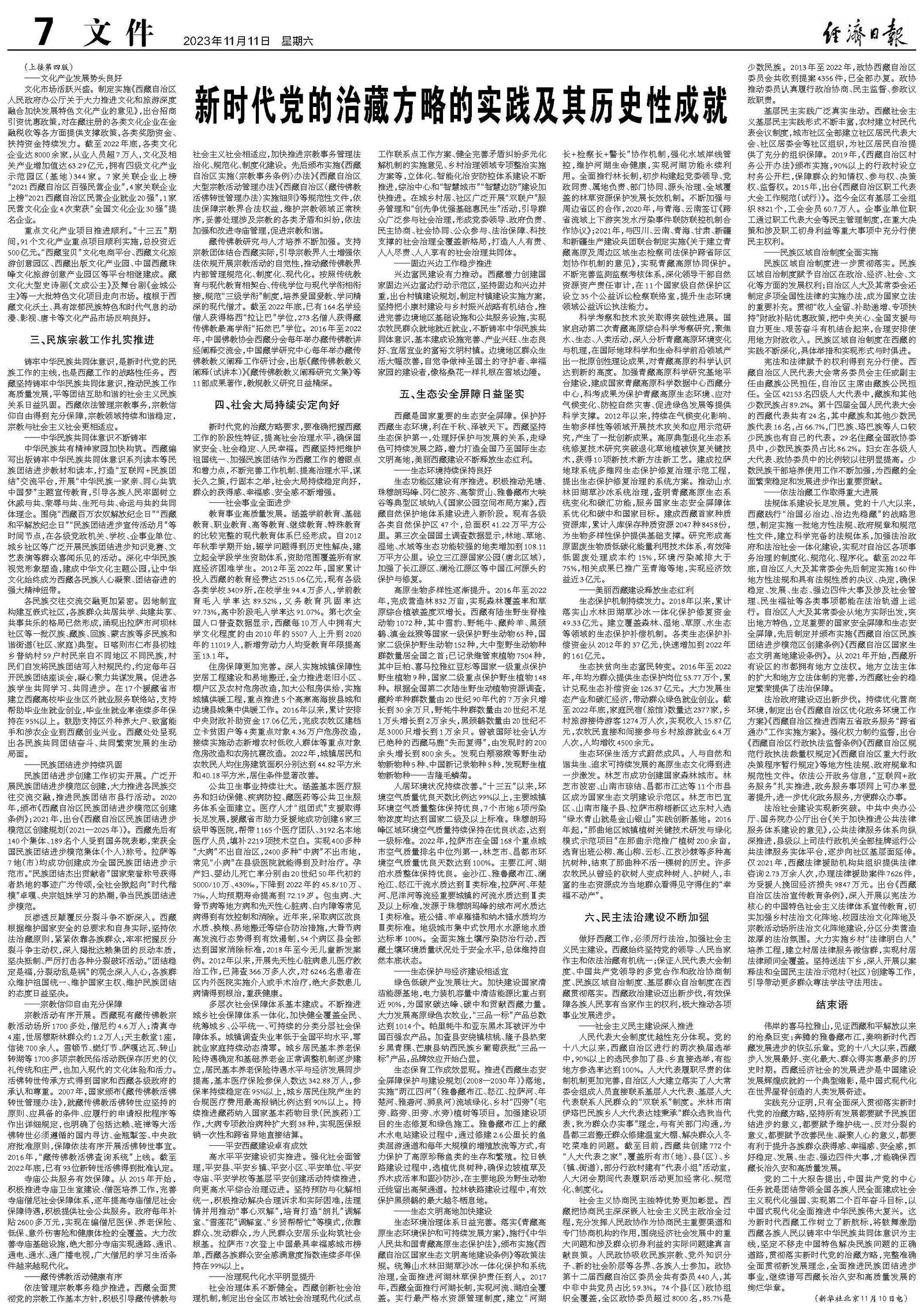 在新时代党的治藏方略引领下,在全国人民大力支持下,西藏各族干部群众团结奋斗,各项事业取得全方位进步、历史性成就。西藏社会大局持续稳定向好、经济建设全面快速发展、人民生活水平不断提高、民族和睦宗教和顺、文化事业繁荣进步、生态安全屏障日益坚实、边疆巩固边境安全、党的建设全面加强,与全国人民一道迎来了从站起来、富起来到强起来的伟大飞跃,踏上了全面建设社会主义现代化国家新征程。
