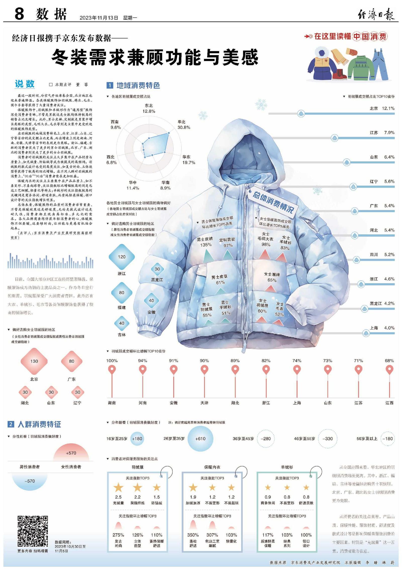消费者对羽绒服的关注点大多集中在产品材质与质量上,如充绒量、防钻绒等成为被提及的高频词。羽绒服的款式设计也受到高度关注,如复古时尚、立体造型等获得了较高的环比增幅。在不同人群对羽绒服的消费上,“00后”“90后”消费者需求更加旺盛。