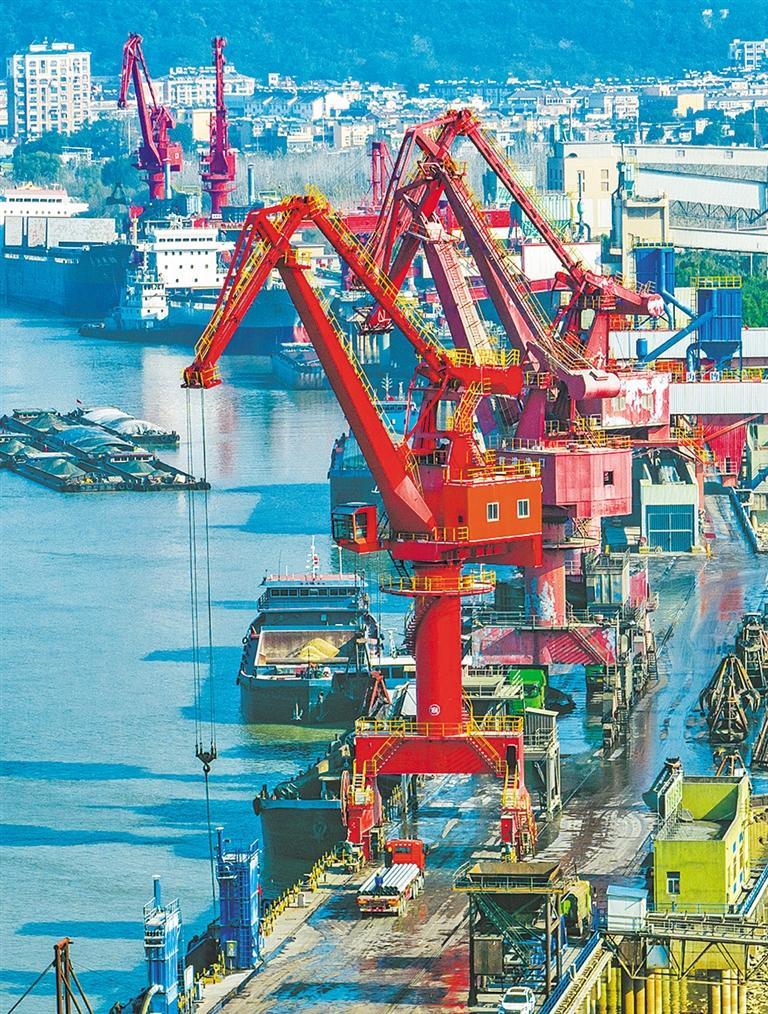 十一月十四日,安徽省芜湖市繁昌区荻港镇荻浦货物装卸码头上的起重设备正在进行装卸作业。近年来,当地大力推进内河水运发展,降低企业运输成本,积极融入长江经济带。肖本祥摄(中经视觉)
