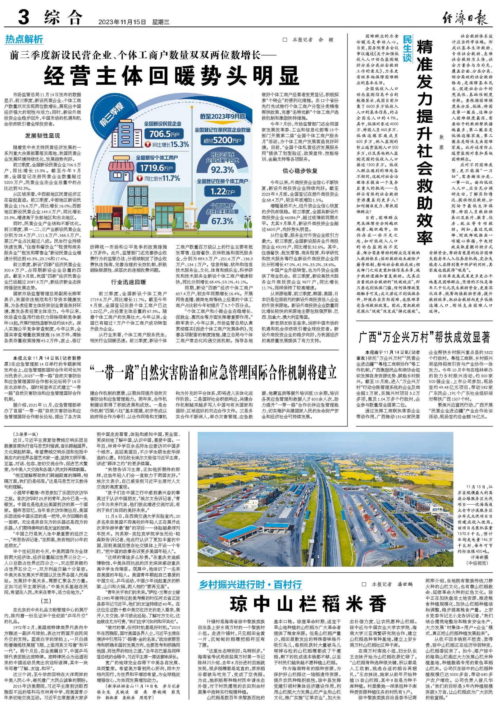 琼中黎族苗族自治县委书记蒋莉萍介绍,当地既有黎族传统刀耕火种的山栏文化,也有靠山栏稻救命、延续革命火种的红色文化。琼中正在加快盘活土地资源,推进粮食种植规模化,加快山栏稻种植结构调整,稳步提高粮食产量。上安乡党委书记王小龙告诉记者,“我们结合撂荒地整治和粮食安全生产,大力发展‘村集体+用户+企业’模式,真正把山栏稻种植发展起来”。
