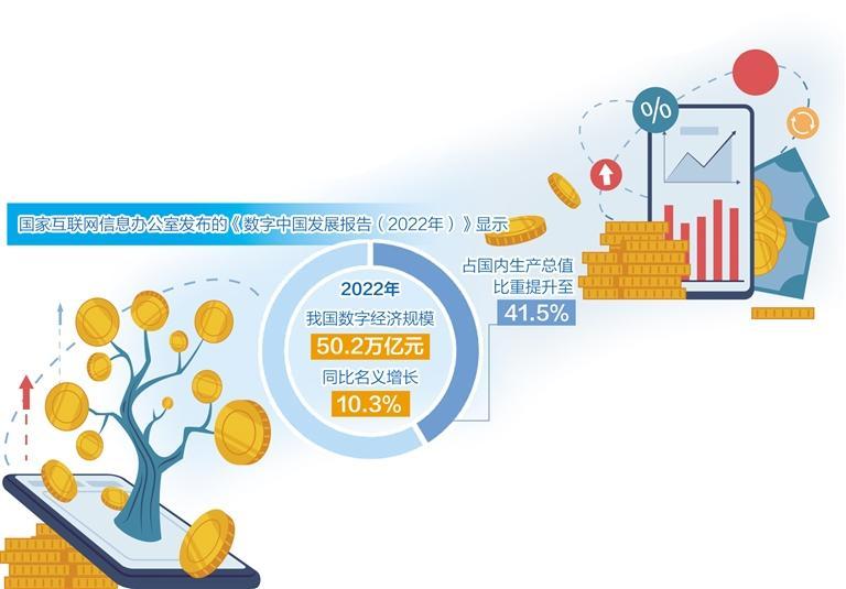 国家互联网信息办公室发布的《数字中国发展报告(2022年)》显示,数字经济成为稳增长促转型的重要引擎。2022年我国数字经济规模达50.2万亿元,总量稳居世界第二位,同比名义增长10.3%,占国内生产总值比重提升至41.5%。