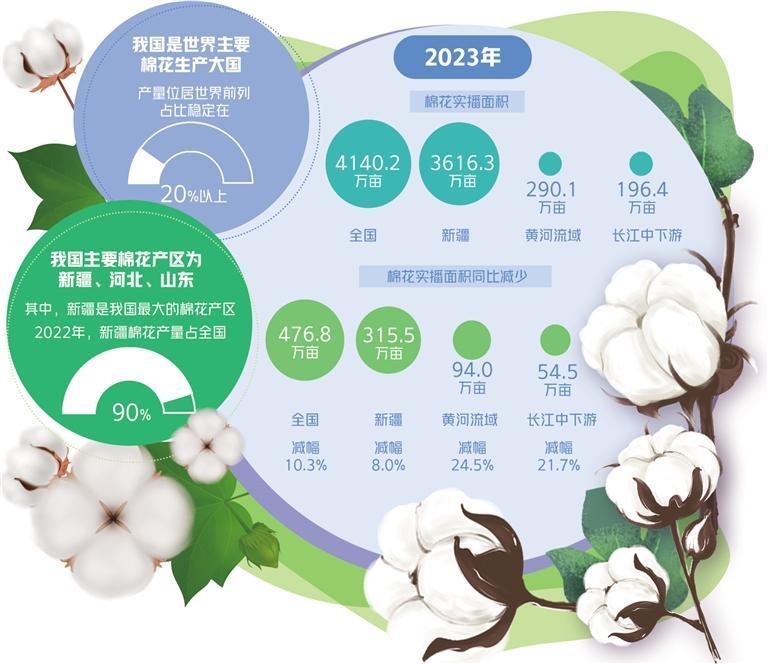 据中储棉信息中心报告,2023年全国棉花实播面积4140.2万亩,同比减少476.8万亩,减幅10.3%;新疆棉花实播面积为3616.3万亩,同比减少315.5万亩,减幅8.0%。